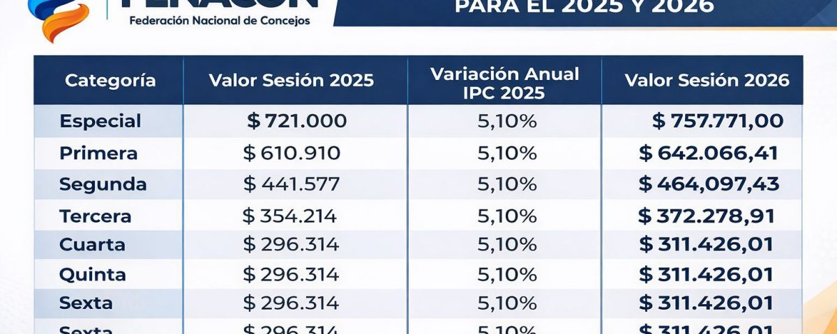 Como es de conocimiento público, el Gobierno Nacional a través del Departamento Administrativo Nacional de Estadísticas -DANE-, el día 8 de Enero de 2026, fijó la variación anual el Índice de Precios al Consumidor (IPC) del año 2025, que permite o autoriza el incremento del valor de los Honorarios que tienen derecho a recibir los Concejales por la asistencia comprobada a las sesiones de los Concejos, el cual se hace con base en la variación que haya tenido el IPC durante el año anterior, por ende, nuestra organización, se permite emitir la presente circular con el fin de dar a conocer el valor que debe tenerse en cuenta de acuerdo a la categoría de cada municipio.